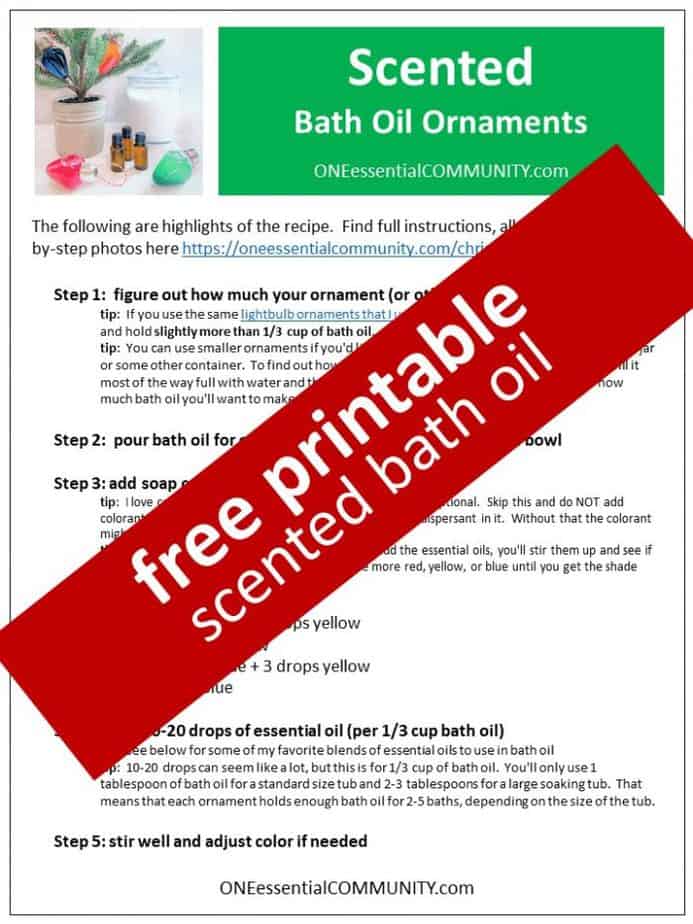 Give a single bath oil ornament, or give a set of all 5 ornaments for an entire season of bathing fun, or combine the scented bath oil with other essential oil DIYs to make pampering spa gift perfect for almost everyone on your list.
