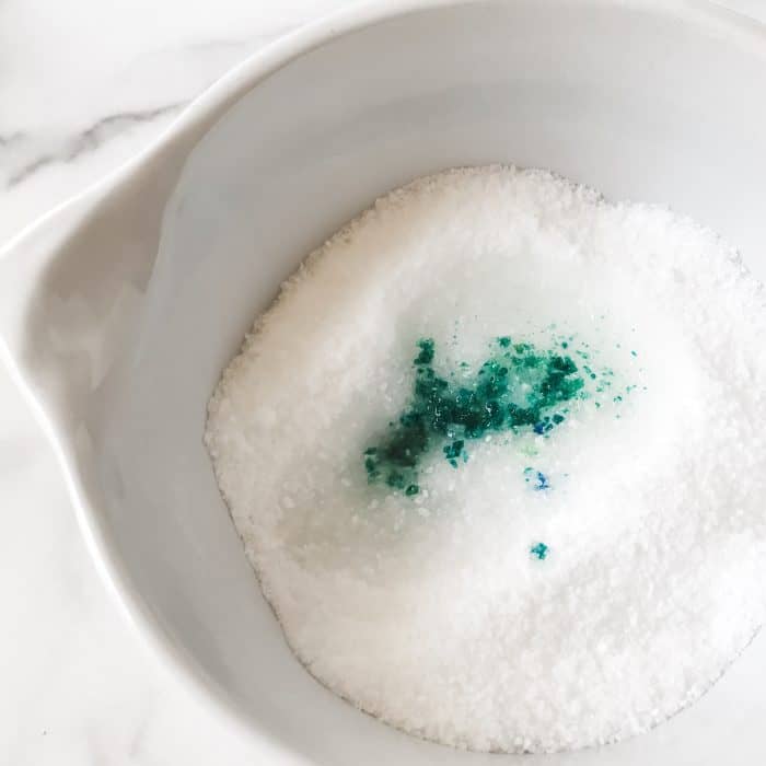 step 7 (optional):Â If you want to color your bath salts, you can add a few drops of soap colorant to the small bowl with fractionated coconut oil.
